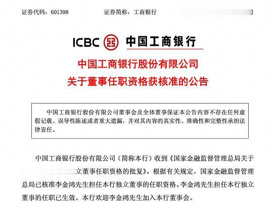 工商银行在公告中表示:“国家金融监督管理总局已核准李金鸿先生担任本行独立董事的任职资格。李金鸿先生担任本行独立董事的任职已生效。本行欢迎李金鸿先生加入本行董事会。”